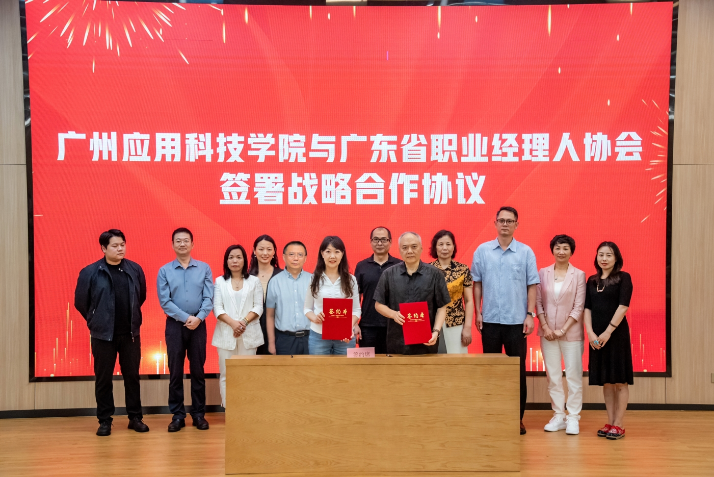 广应科执行校长张光宇和广东省职业经理人协会会长谢小夏分别代表校协签署战略合作协议,标志着该校落实广东省委“1310”具体部署,走深走实校企合作,揭开产教融合新篇章。
