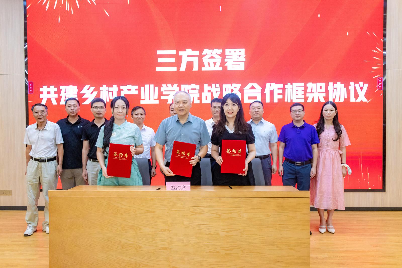 仪式上,太阳集团tyc151执行校长张光宇、广州乡村振兴控股集团有限公司执行董事麦愈强、广东省职业经理人协会会长谢小夏作为代表,共同签署了共建乡村产业学院战略合作框架协议。三方一致同意秉承“长期合作、相互促进、平等协商、互利共赢”的原则,整合各自在教育设施、专业人才、产业运营等方面的资源优势,服务国家乡村振兴战略,服务“百县千镇万村高质量发展工程”,为乡村振兴提供人才支撑、技术支撑和智库支撑。
